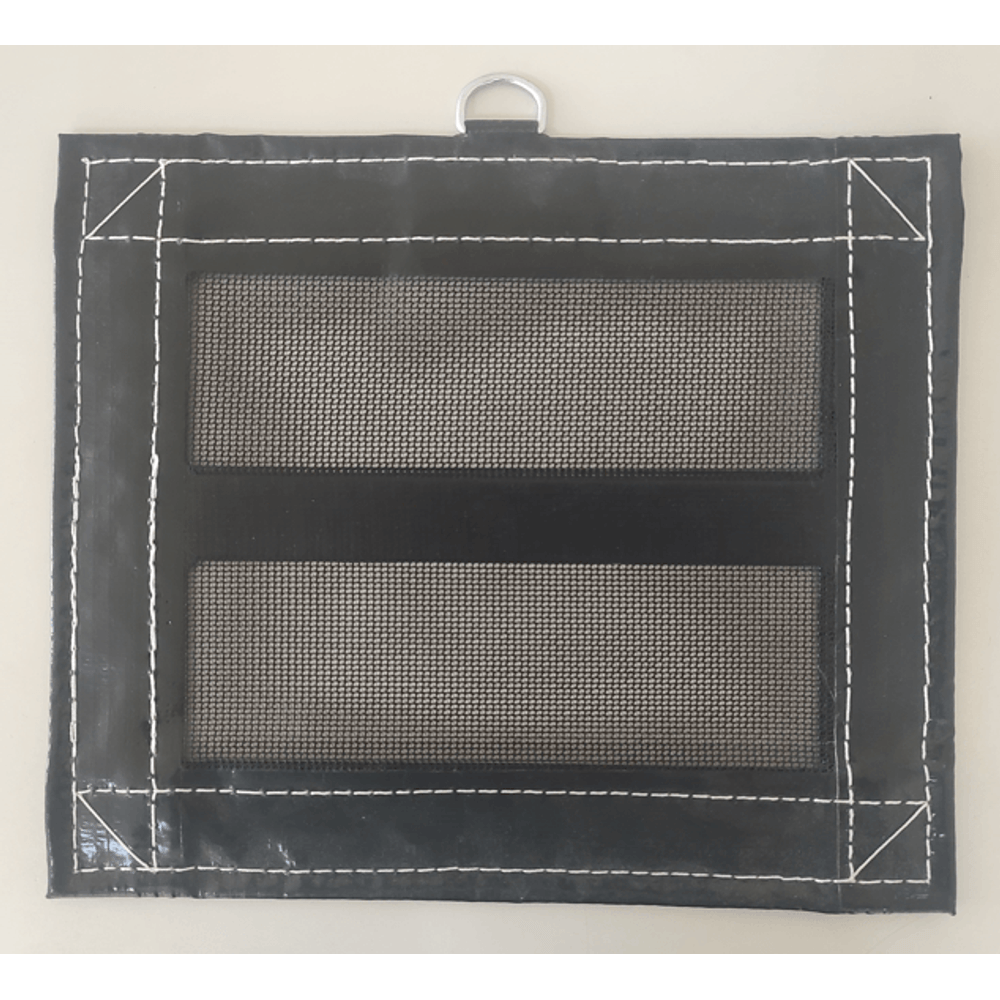 Lona perfurado tipo Sannet, nos acabamentos laminado de PVC reforçado com tecido 100% poliéster.